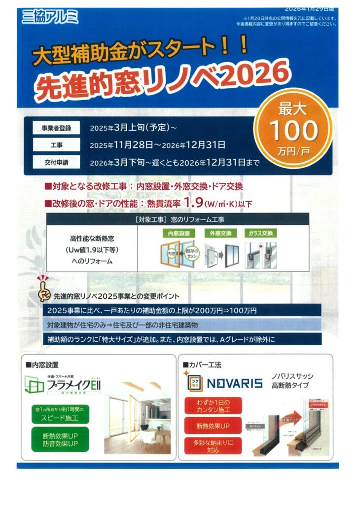 大型補助金補助金がスタート!!先進的窓リノベ2026〈最大100万円〉
