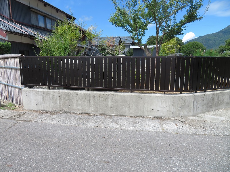 お客様が自分で単管スチールパイプを組んで、竹を入れて設置されていましたが、長年の雨風や日差しにより劣化して見にくくなりました。 アルミフェンスを設置させていただきました。和風ぽく縦格子で納め、格子より風も抜ける様にして、奇麗に仕上がりました。お客様に大変喜んで頂きました。